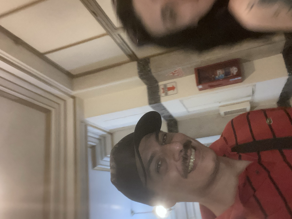 A rotated selfie features two individuals. One person wears a black baseball cap and a red striped shirt, smiling with visible teeth. The second person, positioned in the upper part of the frame, has dark hair. The background includes ornate ceiling molding, a white wall with signage and a decorative box. The lighting is somewhat dim, possibly from indoor sources.
