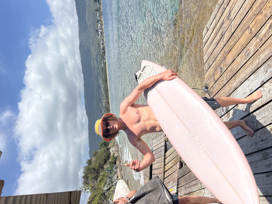 A shirtless man in sunglasses and a colorful hat stands on a wooden dock, holding a pink surfboard with "D. Perse" written on it. The ocean is in the background, with a tree-covered hillside behind it. The man gives a thumbs-up gesture with his left hand. Part of another person is visible on the left.