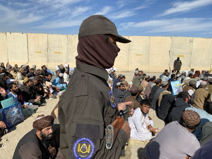 An outdoor scene in Mandisar, Afghanistan, depicts a large gathering of men observed by security personnel under a clear blue sky