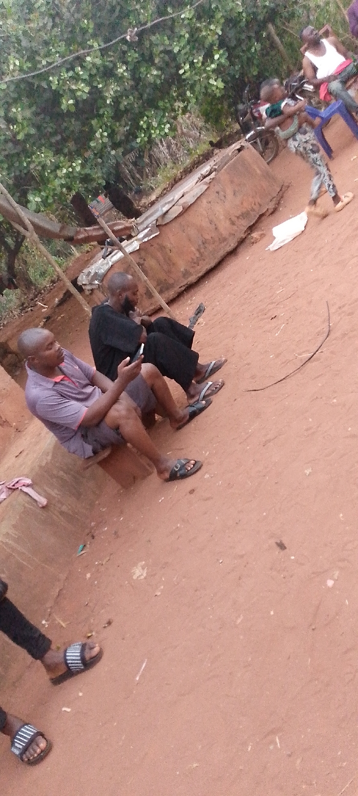 Two men are sitting outdoors, looking at their phones. The man on the left wears a short-sleeved purple shirt and shorts. The man on the right wears a black robe. Both are wearing sandals. Behind them is a long metal container. In the background, a group of people, including children, stand near a parked motorbike. The ground is reddish-brown.