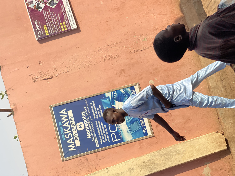Two boys stand near a wall with two signs. The first sign reads "WELCOME TO MASKAWA POS CENTER," advertising Moniepoint services such as terminal issuance, account opening, ATM issuance, data sales, and personal accounts. Below it reads "PC AVAILABLE" followed by a phone number. The second sign reads "Tiny Trends," advertising dealers in UK and US skincare, school items, bags, shoes, underwear, and adult wear with contact information. The boys are looking in different directions. The wall is a light, faded orange, and a corner of a concrete structure is visible.