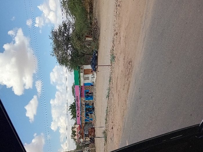 A street scene under a blue sky filled with fluffy white clouds. Buildings line the street, painted in vibrant colors like pink and green. A car is parked near a lush green tree. An asphalt road runs alongside the buildings, with a dirt shoulder dividing it from the vegetation. Power lines stretch across the sky. The view is possibly from inside a vehicle.