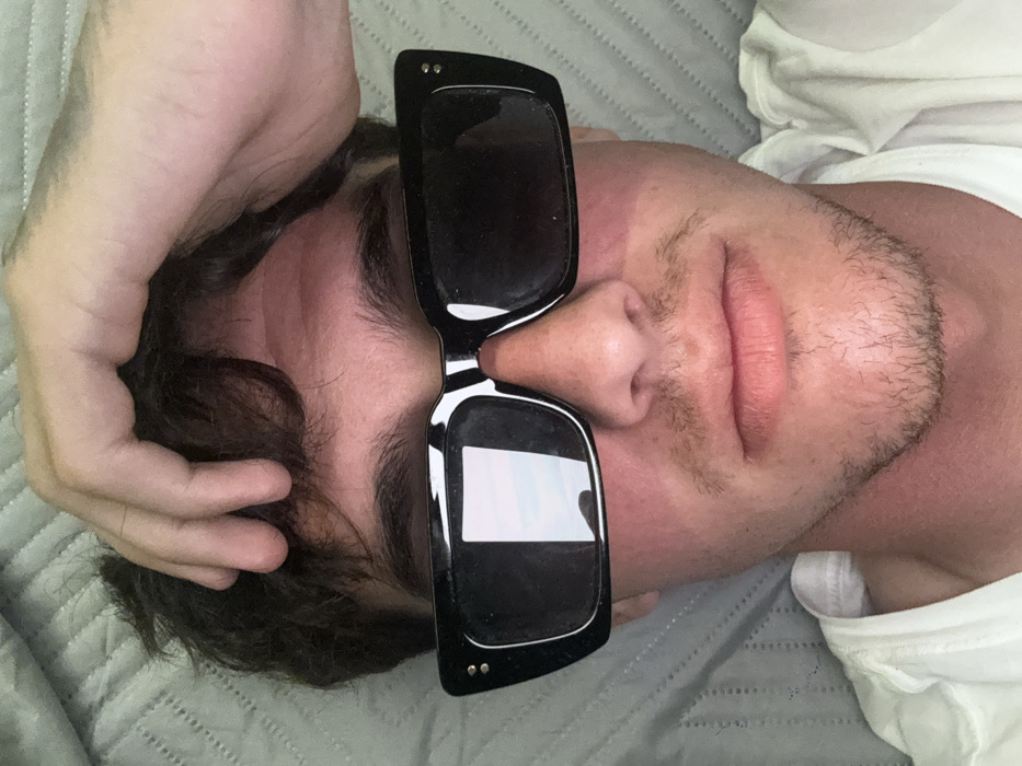 A person lies on their back, head turned slightly. Sunglasses are precariously perched on their nose. One hand is above their head, fingers visible. The person has short, dark hair and stubble. They wear a white t-shirt. The background is a textured, light-colored surface, possibly a bedspread. The sunglasses are large, black, and rectangular.