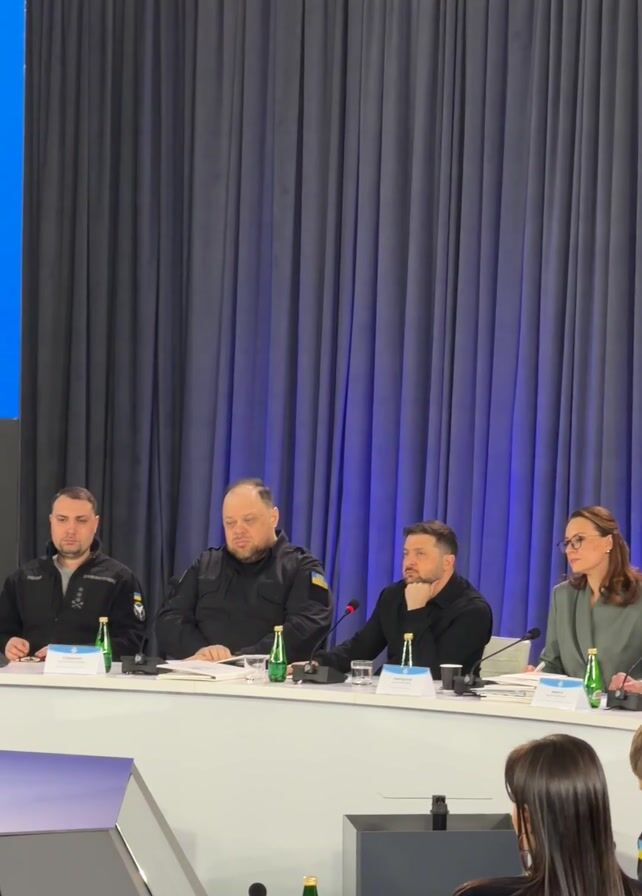 Four people sit behind a long, white table in front of a blue curtain, presumably at a conference or meeting. From left to right, three men and one woman are seated. All three men are wearing dark clothing, while the woman is in a green jacket. The third person from the left appears to be Volodymyr Zelenskyy, President of Ukraine. A person with long, dark hair sits facing away from the camera in the foreground. The setting suggests a serious, official gathering.