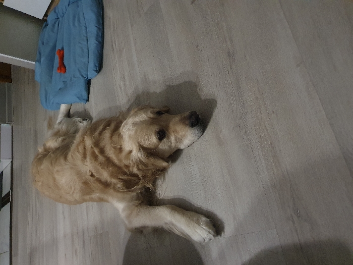 - "A golden retriever lies on a grey laminate floor, partially under a blue puffy coat with a small orange toy attached" by FM-HsUWg2, licensed under CC BY 4.0