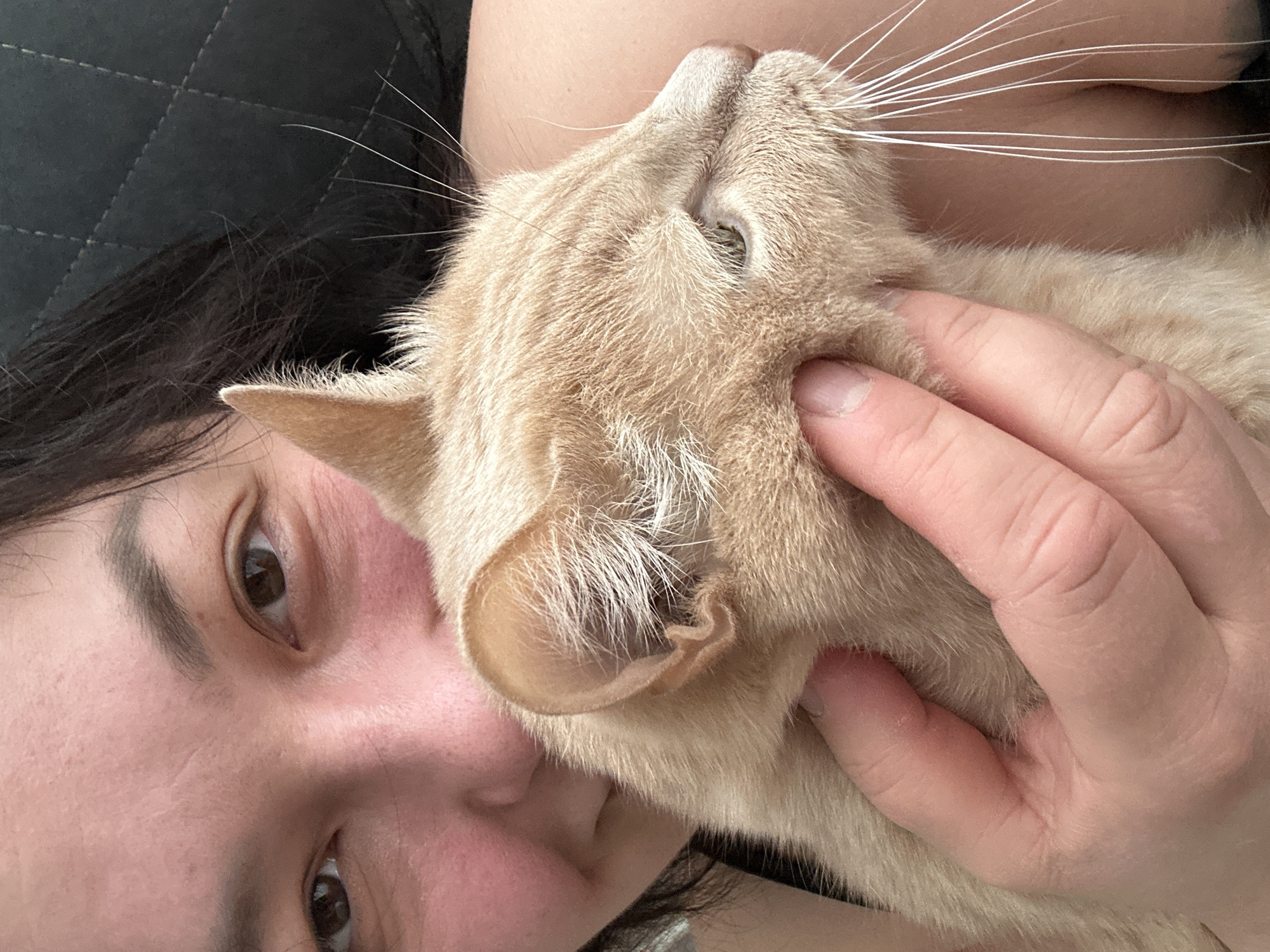 A person is holding a light orange tabby cat. The cat is looking up, and the person's hand is touching the cat's face. The person's face is also visible, with dark hair. The background appears to be a dark surface. There is no information available to determine the location is Chaikovsky, Russia.