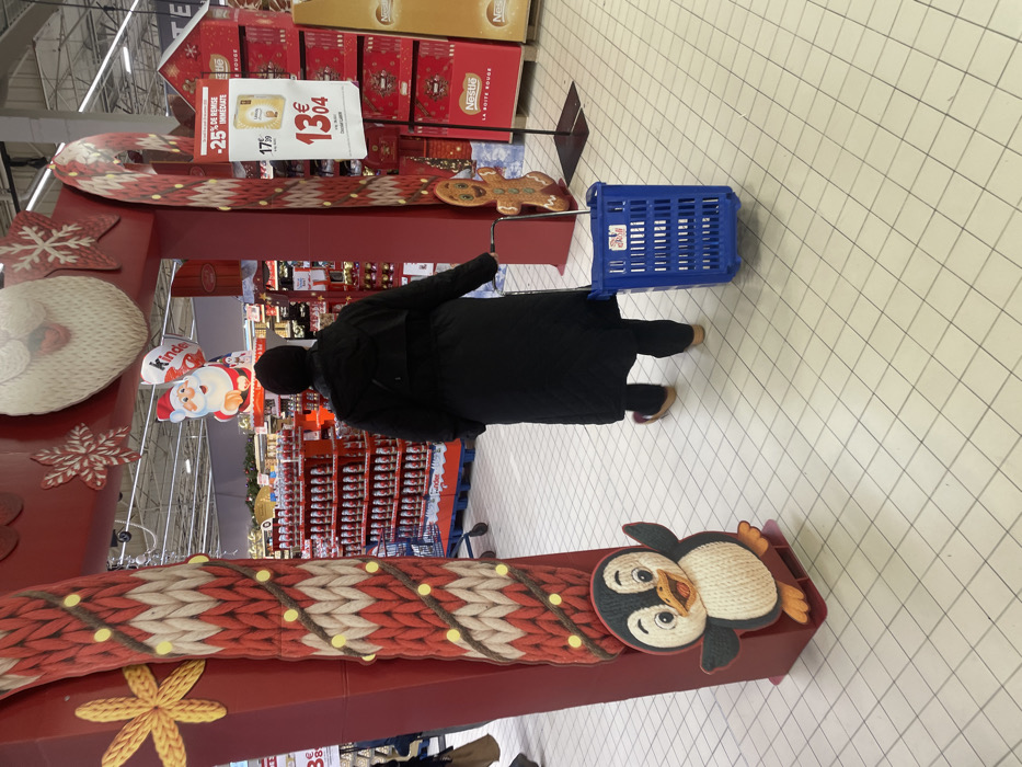 - "A person in a black coat and hat pulls a blue shopping basket through a store decorated for Christmas" by FM-Tmicy2, licensed under CC BY 4.0