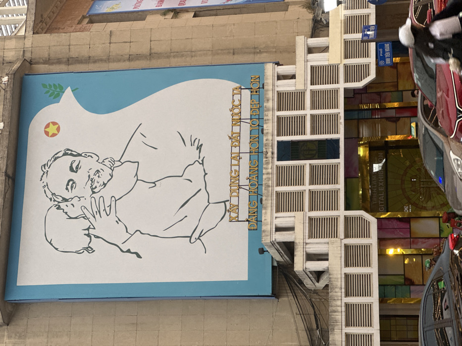 An outdoor, eye-level photograph captures a segment of a multi-story building facade situated at the intersection of Tràng Tiền and Đinh Tiên Hoàng streets in Hà Nội, Vietnam. A prominent rectangular billboard dominates the upper section of the facade. This billboard displays a black line-art illustration on a white background, framed by a light blue border. The illustration depicts a smiling Ho Chi Minh embracing a child. A red circle containing a single yellow star is positioned in the upper right quadrant of the illustration. Beneath the artwork, gold Vietnamese text reads "XÂY DỰNG LẠI ĐẤT NƯỚC TA ĐANG HOÀNG HƠN TÔ ĐẸP HƠN" (Rebuilding our country more dignified and beautiful). Below the billboard, the building exhibits several tiers of rectangular structures resembling louvered windows or vents, constructed from a light-colored material. The ground level features a modern entrance with a multi-colored, segmented glass facade. The text "TRIỂN LÃM DIGITAL EXHIBITION" is partially visible above this entrance. The foreground reveals a busy urban street scene with multiple vehicles in motion, including a black sedan, a silver hatchback, and a red SUV. A person wearing a white baseball cap is partially visible on the right, operating what appears to be a motor scooter. Utility lines are discernible against the building's left side.