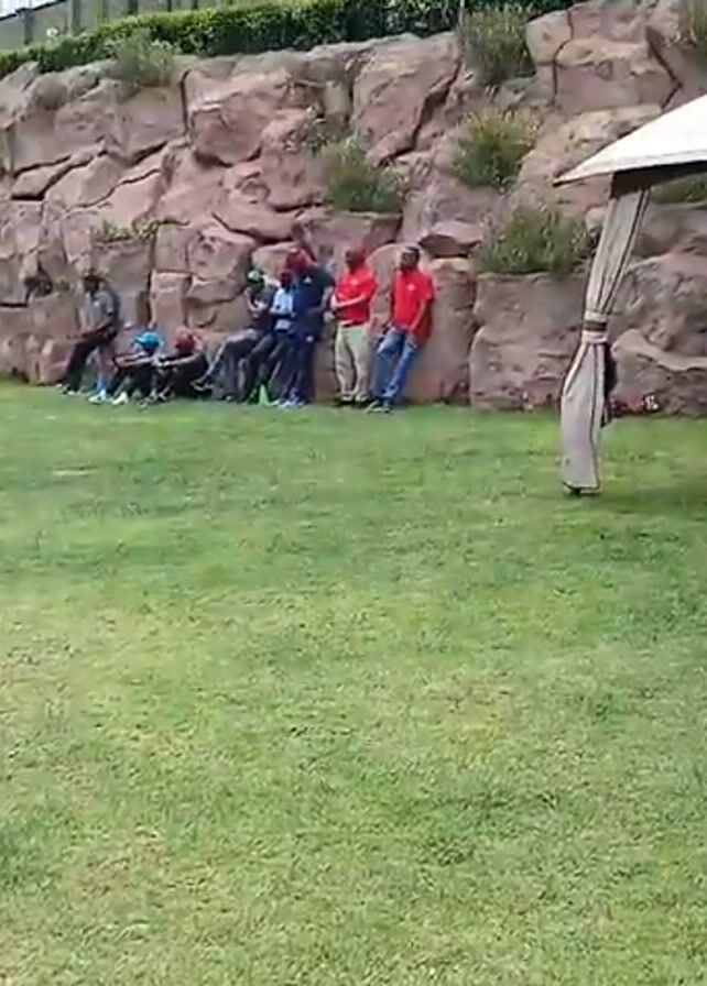 A wide shot pans across a large grassy field. People are standing and sitting on the grass. Some are wearing red shirts, others are in blue. A rock wall is in the background, with trees visible above it. There is a gazebo on the edge of the field, with people sitting under it. There are glasses and a jacket on a table in the gazebo. A person in a yellow vest is sitting at the table, looking at their phone.