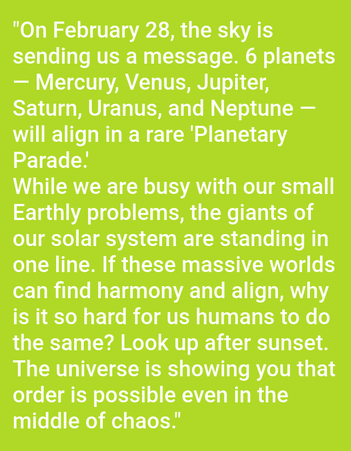 The scene is a digital graphic featuring white text set against a solid lime green background. No specific physical location within the city of Unknown, Unknown is depicted in the graphic. The text itself is a message about a "Planetary Parade" on February 28, stating that six planets—Mercury, Venus, Jupiter, Saturn, Uranus, and Neptune—will align. It includes a reflective commentary contrasting human problems with the harmony of the solar system, suggesting to "Look up after sunset" as "The universe is showing you that order is possible even in the middle of chaos." There are no individuals, other objects, or actions visually represented beyond the static text on the colored background.