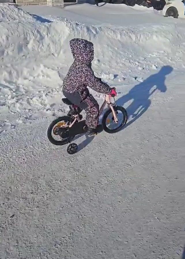 - "A young child in a hooded snowsuit is riding a pink bicycle with training wheels down a snow-covered street" by FM-63mZD2, licensed under CC BY 4.0