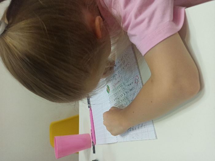A young individual is depicted from behind, seated at a white table and engaged in writing. The person has light brown hair pulled back into a ponytail with a white hair tie and is wearing a pink short-sleeved t-shirt. The right arm is bent at the elbow, resting on the table, while the left hand holds a writing instrument, actively forming characters on a lined notebook. The notebook displays multiple lines of handwritten text, consistent with Cyrillic script or numerical practice. To the left on the table, a pink plastic cup and a pink pen are visible. The background consists of a plain light-colored wall, with a yellow chair partially discernible behind the pink cup. The indoor setting's specific location within Irkutsk, Russia, is not identifiable from the visual information presented in the image.