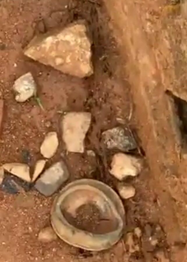 The camera points straight down into a shallow excavation in reddish-brown dirt. The edge of the excavation is visible along the right side, composed of darker, more solid earth. Discarded artifacts and stones are scattered in the dirt. Prominently, a partial ceramic or pottery ring lies centered in the frame. Small, angular stones surround it. A wadded piece of light-colored material, possibly plastic or fabric, sits in the lower part of the frame. A few stray blades of grass poke through. The light is diffused and bright. The camera is static.