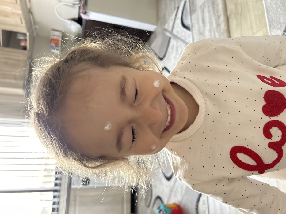 An indoor scene in the city of Zlatograd, Bulgaria, depicts a young child from the chest up, positioned centrally. The child, with light brown hair backlit by strong natural light, has eyes closed and is smiling broadly, showing teeth. Three distinct white spots of a substance are visible on her face: one on the forehead, one on the upper left cheek, and one on the upper right cheek. A small gold hoop earring is present in the child's right ear. She wears a white long-sleeved top adorned with numerous small black polka dots and a large red "love" graphic across the chest. The background features a kitchen environment with a window and vertical blinds providing bright illumination on the left, and kitchen cabinets, a sink with a gooseneck faucet, and counter space on the right. A light-colored rug with a dark geometric pattern is visible on the floor, with a colorful toy partially discernible on the left.