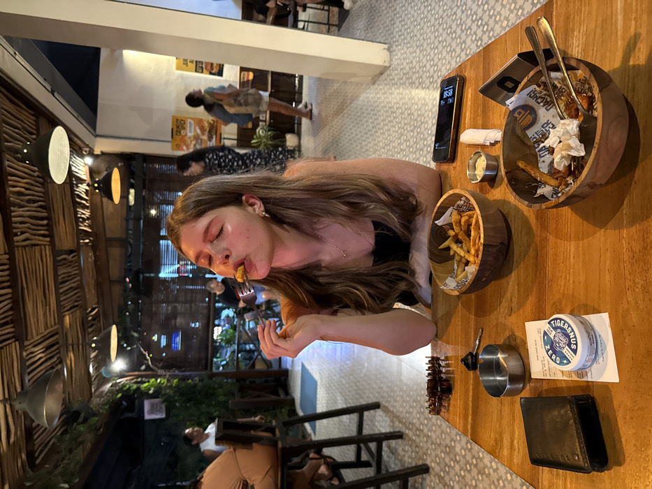 The image depicts an indoor scene within a restaurant located in Kerobokan, Indonesia, at night. The foreground is dominated by a wooden table where a young Caucasian female with long, light brown hair is seated. She wears a dark top and is captured mid-action, with her eyes closed, bringing a piece of food (appears to be a fried potato or wedge) on a fork to her mouth. On the table in front of her are several items: a wooden bowl containing french fries, a second partially consumed wooden bowl with food remnants and two metal utensils, a small metal ramekin with white sauce, a black leather wallet, a white container labeled "TIGERSNUS ZERO" on top of a white receipt, a large brown hair claw clip, a set of keys, a small metal dish/ashtray, and a black smartphone displaying the time 10:55. The restaurant features an open-concept design with a high ceiling constructed from woven wood or bamboo slats and exposed beams, from which multiple industrial-style pendant lights hang. Green foliage is integrated into the overhead decor. The floor is tiled with a geometric pattern. In the background, other patrons are visible: a person with their back to the camera seated at a high table on the left, a man in a white shirt further back, and two women standing near a white wall on the right, which displays large yellow-themed posters advertising food items such as "CRUNCHY & SPICY." Dark wooden blinds or slatted screens are visible in the far background.