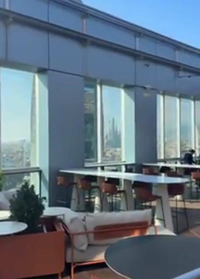 high-rise restaurant or lounge setting, focused on a view through a large window. The window frames the Sagrada Familia in Barcelona, Spain, which is still under construction as evidenced by the crane present. The interior of the restaurant has a modern design with a wooden floor, various seating arrangements including high tables with chairs, and lounge-style furniture. The overall atmosphere appears calm and the lighting is bright due to the clear, sunny day.