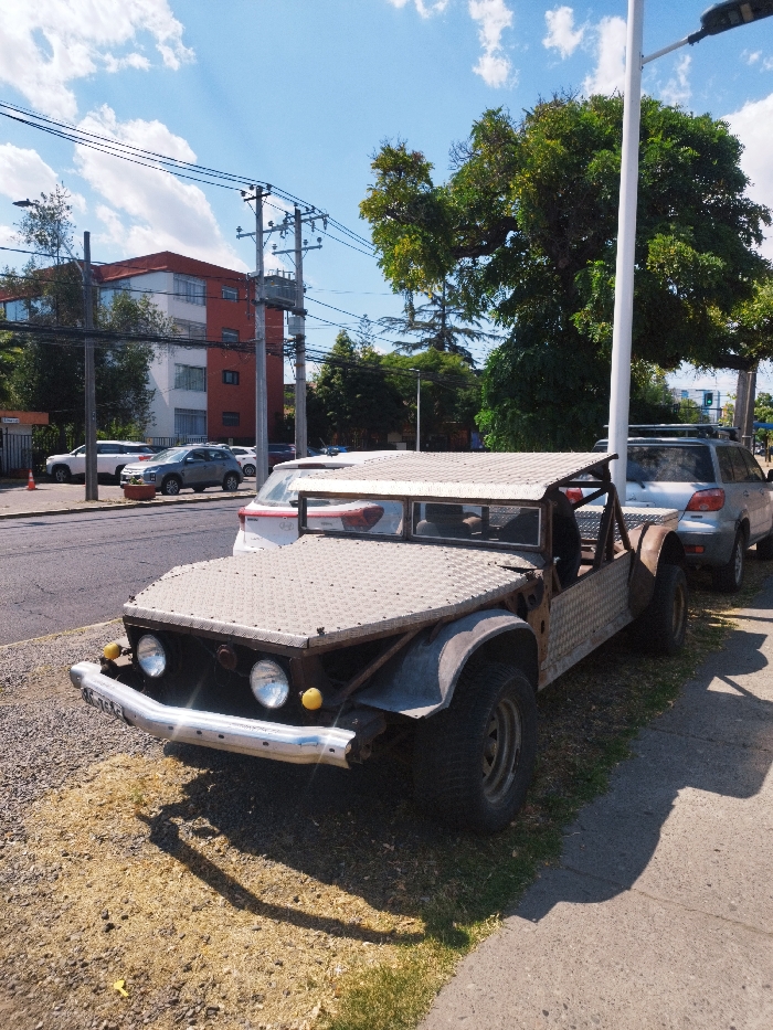 A weathered, custom-built off-road vehicle sits parked on the side of a road. Its body features diamond-plate steel and a minimalistic design with exposed chassis elements. Round headlights and a bent chrome bumper adorn the front. Other vehicles, including a silver SUV and a white car, are visible parked nearby along the street. A multi-story building, utility poles, a white pole and lush green trees form the background. The sky above is partly cloudy.