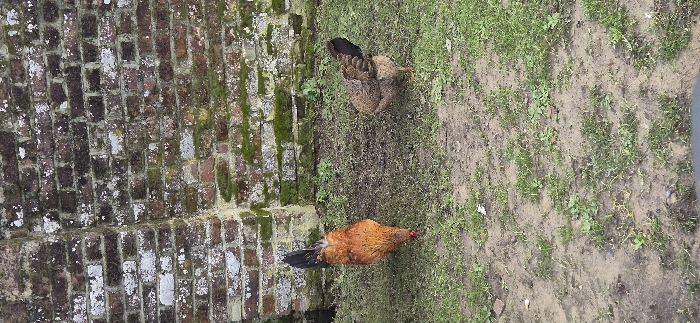 The image displays an outdoor scene located in Beuvry-la-Forêt, France. Two domestic fowl are present on a patch of uneven ground composed of bare soil interspersed with sparse green grass and weeds. In the foreground-left, a chicken with primarily reddish-brown and black plumage is observed with its head lowered towards the ground, indicative of a pecking action. Its tail feathers are dark and upright. To the mid-right, a second chicken, mottled brown and grey with dark tail feathers, stands upright, oriented towards the left. The background features a weathered brick wall. The bricks are predominantly dark red-brown, exhibiting significant wear with patches of white discolouration, consistent with efflorescence or faded paint, and widespread growth of green moss and lichen. The ground beneath the wall also shows areas of more concentrated green moss. The overall environment suggests a rural or semi-rural setting. No human figures or direct interactions between the chickens are evident.