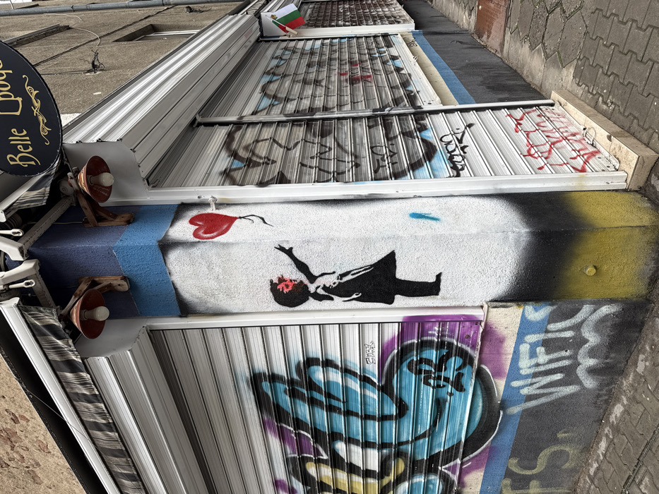 The image displays an exterior street corner in Sofia, Bulgaria, featuring a building with graffiti and street art