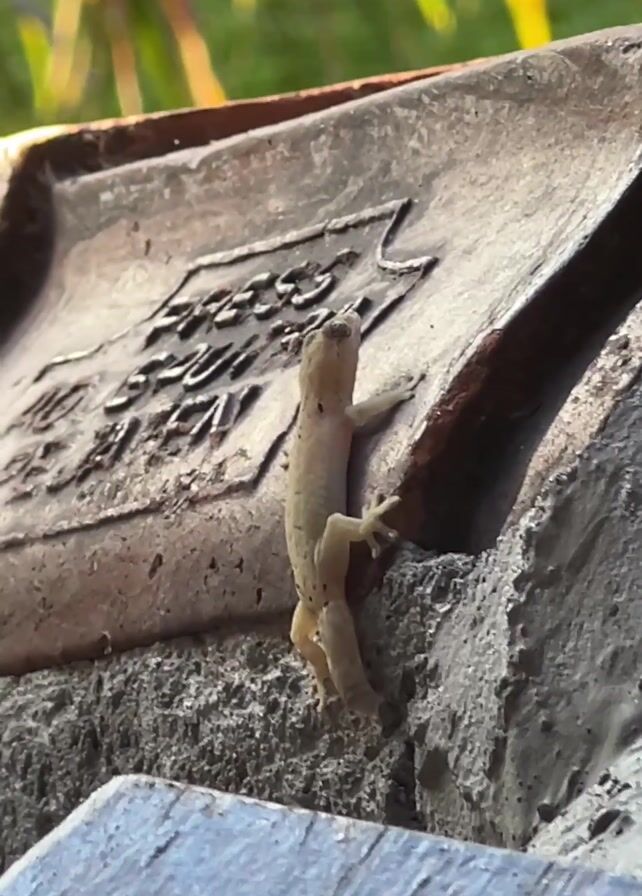 small, pale lizard with dark spots climbing on a gray, rough surface. The lizard has a long, slender body and four legs, and it is moving upwards. Behind the lizard, there is a piece of brown tile with embossed writing on it. The background is blurred, but it appears to be outdoors with green foliage and glimpses of bright light. The camera is positioned close to the lizard, providing a detailed view of its movement and the texture of the surfaces it is climbing on.