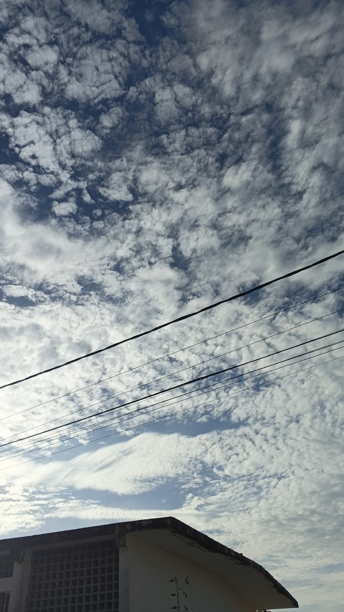 sky filled with altocumulus clouds over Juan Griego, Venezuela. Three parallel sets of overhead electrical wires cross the middle ground of the frame. The bottom of the image shows the corner of a building, with a concrete roof overhang and a screened window area.