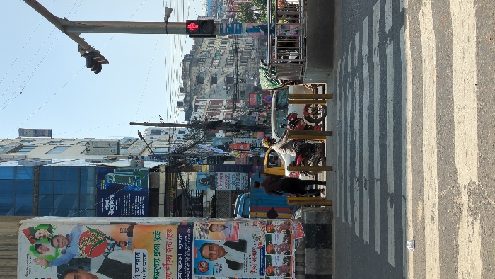 An urban street scene is presented with pedestrian crossing stripes visible. The left side of the frame is lined with advertising posters and banners, featuring images of people and text in Bengali, including "না আব্বাস", "সদীয় আসন", and "জারুণ্যের প্রথম ভোট". A street signal is visible, showing a red light. The background reveals densely packed buildings and utility wires against a clear sky. A person in a yellow vehicle appears to be crossing the street.