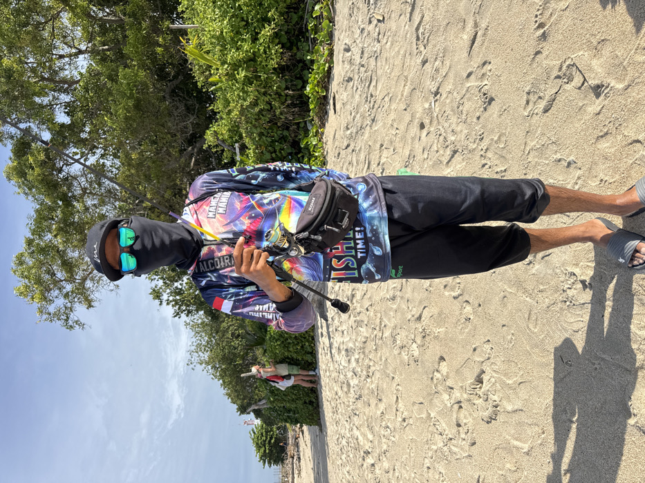 The image depicts a male individual standing on a sandy beach in Kuta, Indonesia, facing the camera. The subject wears a black baseball cap, mirrored blue sunglasses, and a black face mask covering the lower face and neck. He is dressed in a long-sleeved, colorful graphic fishing shirt featuring an Indonesian flag motif on the left arm, "MAKA MANIA" text, "ALCOBRA" branding near the zipper, and "FISH TIME!" text on the chest. He wears black ¾ length athletic shorts with a green logo on the left thigh and grey slide sandals. A black fanny pack with "ALCOBRA" branding is strapped across his chest. He holds a fishing rod with an attached reel in his right hand, positioned vertically to his left side. The sandy foreground displays footprints and a cast shadow of the subject. In the mid-ground to the left, two individuals in light-colored attire are partially visible near dense green foliage. Further in the background, a white structure resembling a lighthouse or beacon is partially visible, along with some driftwood on the sand. The background consists of lush green trees and vegetation, under a partly cloudy blue sky.