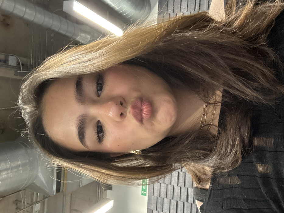 The image is a head-and-shoulders selfie of a young female, positioned centrally and looking directly at the camera