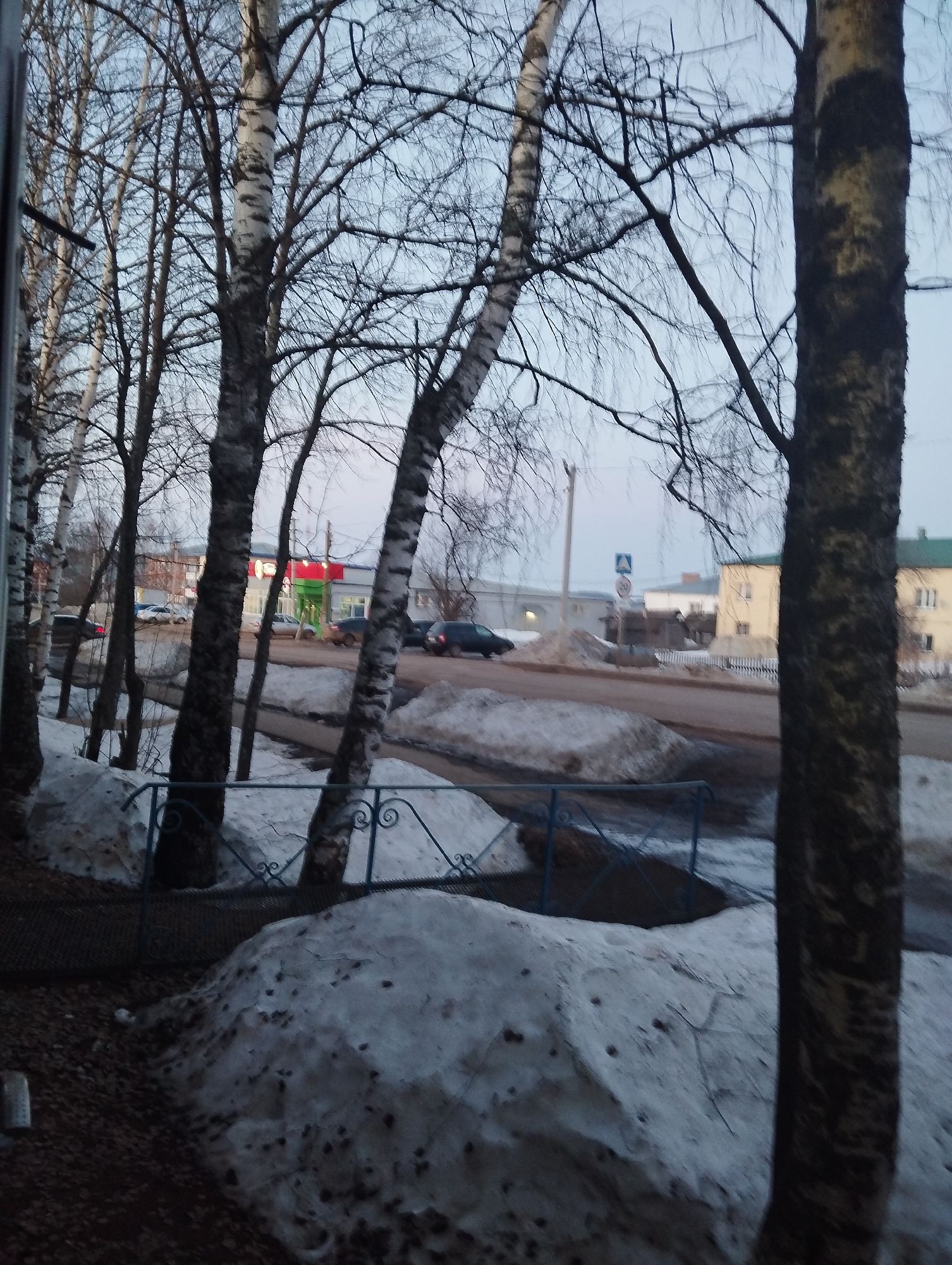 The image depicts a street scene in Krasnogorskoye, Russia, during what appears to be late winter or early spring. Snow remains on the ground, forming piles along the roadside and in front of a decorative metal fence. A row of birch trees, their branches bare, lines the foreground. In the background, across the street, are buildings, including a single-story commercial structure with red and green signage. Several parked cars are visible, along with street signs. The sky is overcast. No people are visible in the image.