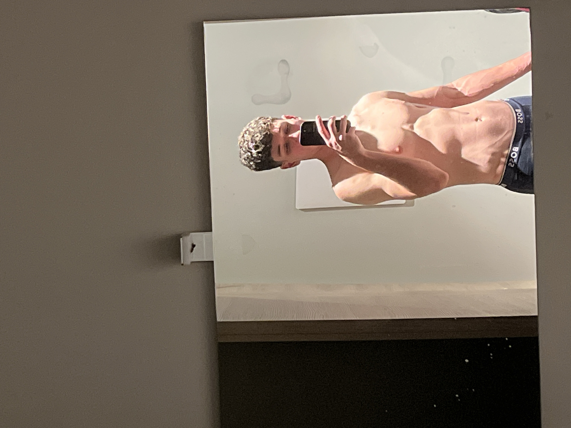 The image depicts a young adult male taking a mirror selfie in an interior setting in Turin, Italy, likely a private residence or hotel room. The man, with short, curly, light brown hair, stands shirtless, displaying a lean, muscular physique. He is wearing dark-colored boxer briefs with the "BOSS" brand name visible in reverse on the waistband. He holds a dark-colored smartphone, partially obscuring his face, to capture his reflection. The mirror's surface exhibits several faint, irregular smudges or marks. The background visible in the reflection is a light-colored wall. To the immediate left of the reflected mirror, a dark panel, possibly a wardrobe door, with a vertical light-colored edge is visible. A white plastic clip or hook is attached to the top edge of the mirror frame. The lighting appears artificial, casting subtle shadows on the man's body. The precise location within Turin is not discernible from specific architectural features or identifying external markers.