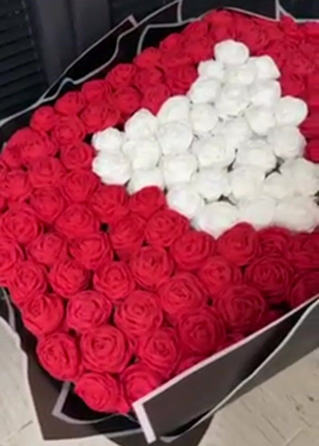 A close-up shot displays a large floral arrangement laid on a surface near a window with closed blinds. The arrangement is composed of numerous red roses forming a background for a white heart shape created from white roses. The arrangement is wrapped in black and white paper. The camera circles to provide a better view of the bouquet.
