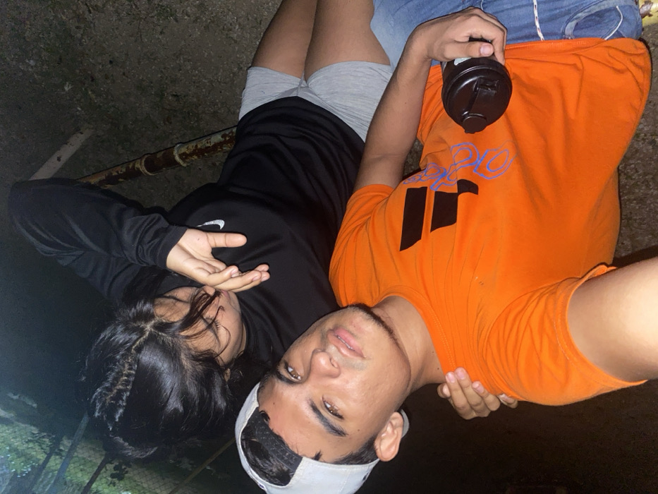Two people are lying on the ground next to a pipe. The person on the left is wearing a black hoodie and grey shorts, with long dark hair. They have their hand near their face. The person on the right is wearing an orange shirt with a large black logo and blue writing. They are also wearing a white baseball cap and holding a black water bottle. They are looking at the camera. The ground is dark and there is some greenery in the background.