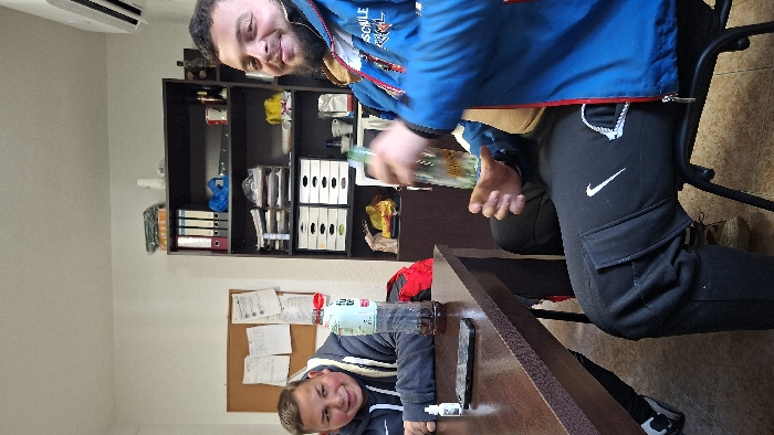This image depicts an indoor scene in Bansko, Bulgaria, featuring two males seated at a brown wooden table within an office-like environment. The individual on the left is a male with light skin and short, dark hair, wearing a dark hooded sweatshirt with white trim. He is seated with his hands on the table, looking towards the right with a slight smile. The individual on the right is a male with darker skin, a full beard, and short, dark hair, wearing a blue zip-up jacket over a tan garment and black athletic pants with a white Nike swoosh logo on the left thigh. He is seated on a black metal chair, holding a clear glass bottle containing a yellowish-brown liquid in his right hand. He is looking directly at the viewer with a smile. On the table between the two individuals are a small white dropper bottle, a black smartphone, and a partially consumed plastic bottle of "Tube" brand iced tea. A red fabric item is partially visible under the table near the left individual. The background features a plain white wall with a cork board holding several pinned papers on the left. To the right, a dark brown open shelving unit is visible, containing various office items including binders, white drawer organizers, mugs, and miscellaneous objects. An air conditioning unit is mounted on the upper right wall. The floor is light-colored tile.