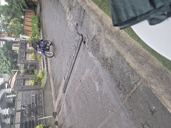 A blue motorcycle with a rider is on a gray, cracked asphalt road. The road is lined with a black speed bump-like object. A building with a dark metal fence and green shrubs is visible on the left. The right side features green turf and a white table, partially obscured by a green cloth. The image appears slightly rotated counterclockwise. The motorcycle is moving toward the top of the frame.