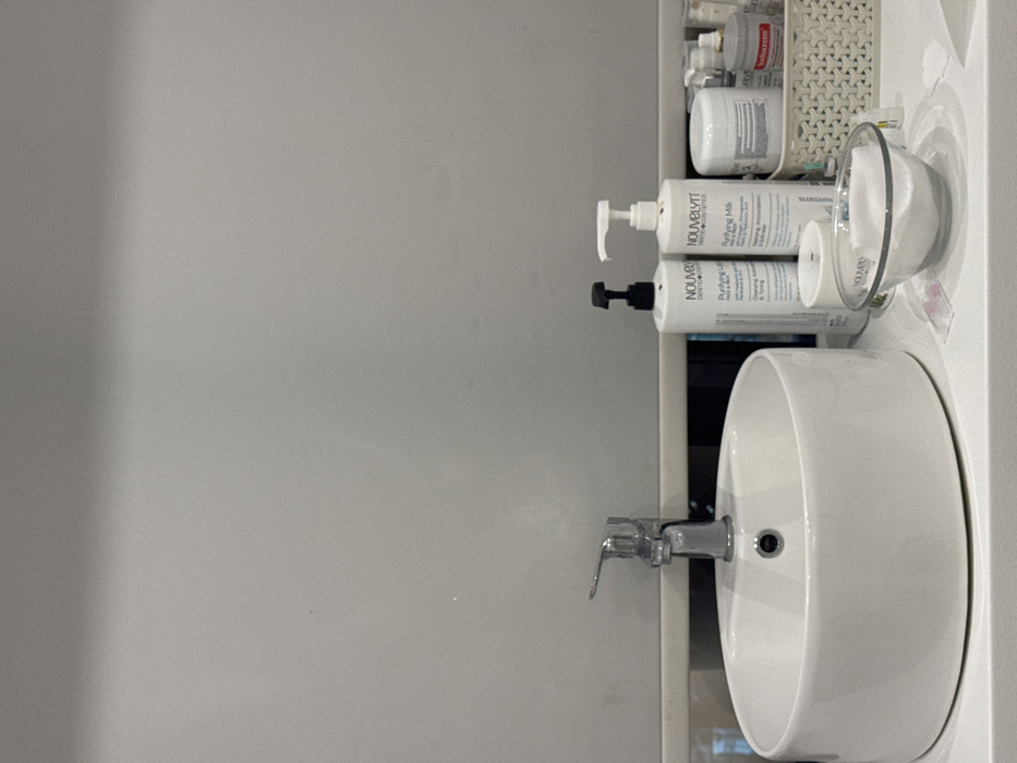 A white, circular bathroom sink is attached to a gray wall. Above the sink, on the countertop, are several cosmetic products. Among them are bottles labeled "NOUVELYN," suggesting skincare items. A clear bowl sits near the products. A small, gray basket filled with various items is also visible on the counter, indicating the storage of toiletries or other personal care accessories. The overall impression is a modern, well-organized bathroom space.