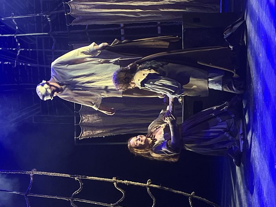 On a theatrical stage in Novoshakhtinsk, Russia, illuminated by blue stage lighting, three actors perform. A tall male actor, wearing a light-colored, long-sleeved tunic and a cap, stands on a dark elevated platform in the background, looking downward. To the left and slightly below him, a female actor with long, reddish-brown hair kneels on the stage floor. She wears a light-colored dress with a low neckline, is smiling, and holds hands with a second male actor. This second male actor also kneels on the stage floor, facing the female, and wears a light-colored tunic with wide sleeves, a patterned jerkin, and a dark cloak draped over his left shoulder. The background features a rope ladder or rigging structure on the left and several vertical panels of textured, light-colored fabric, resembling sails or canvas, on the right.