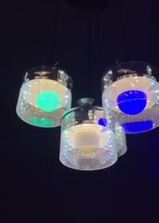 light fixture hanging from a dark ceiling. The fixture has three cylindrical shades made of clear plastic. Each shade is decorated with small white lights and topped with a black rim featuring logos of luxury car brands like Rolls Royce, Bentley, and Lincoln. Inside each shade is a spherical light that emits a different color. One is green, another is blue, and the third appears white/purple. The camera slowly pans around the fixture, providing different angles and perspectives. The environment is otherwise dark, with only faint hints of objects in the background.