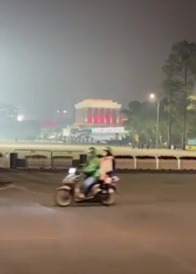 traffic in front of a large building at night. It is partially obscured by fog. The building is lit with white and red light. A line of flags are slightly visible in front of the building. Motorbikes and a car are traveling across the road in front of the camera. People on the motorbikes appear to be wearing winter clothes and face coverings. Trees are visible to the right of the building. Streetlights are on.