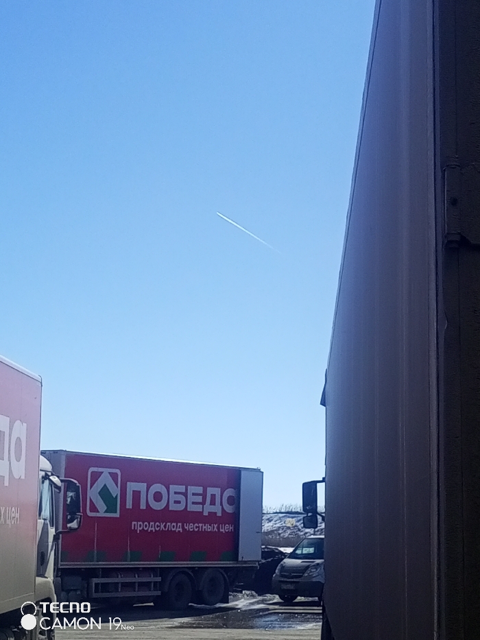 The image displays an outdoor scene in Pridorozhnyi, Russia, under a clear, bright blue sky. A single white aircraft contrail extends diagonally from the upper left to the lower right of the sky. The right side of the frame is occupied by a vertical, light-colored panel, consistent with the side of a large truck or industrial building. On the left, the front portion of a white box truck is partially visible, showing some Cyrillic text. In the midground, a prominent red box truck is parked, featuring a white 'ПОБЕДА' (Pobeda, meaning Victory) logo with a green geometric emblem, and the Cyrillic text 'продсклад честных цен' (honest price food warehouse) below it. Behind the red truck, a dark-colored van or smaller truck is partially discernible. The ground beneath the vehicles is a dark, possibly asphalt or gravel, surface exhibiting several wet patches. In the distant background, a light-colored mound, potentially snow-covered, is visible, along with sparse dark vegetation. No individuals are present in the scene. A 'TECNO CAMON 19 Neo' watermark is located in the lower left corner of the image.