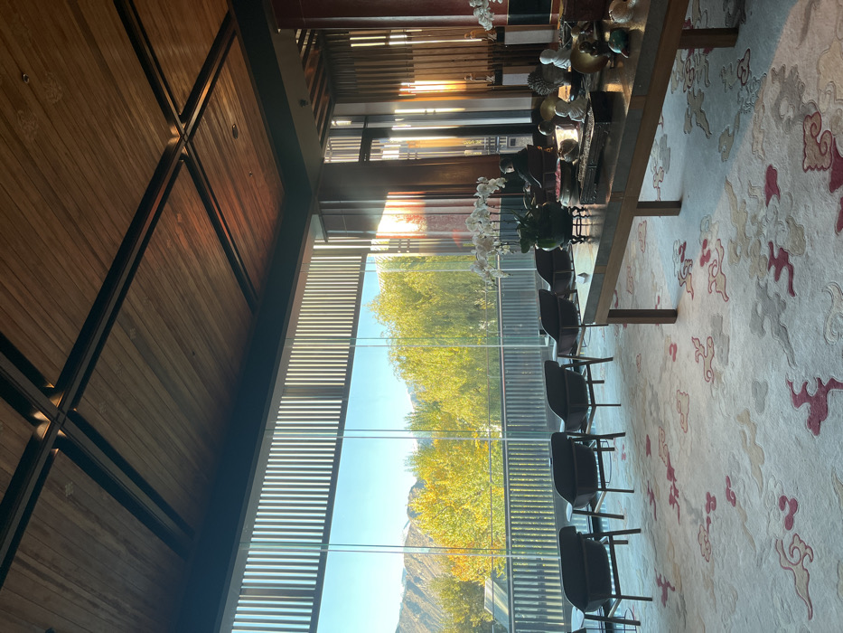 The scene depicts an interior lounge or waiting area within a building located in Chengguan District, China. The room features a high, slatted wooden ceiling with prominent dark crossbeams and a light-colored carpet adorned with stylized red, pink, and grey cloud patterns. A large, floor-to-ceiling glass window wall occupies the left side, offering an unobstructed view of an outdoor landscape. Outside the window, a dark railing is visible, followed by dense clusters of vibrant yellow and green deciduous trees. In the background, distant mountains or hills display patches of snow or bare rock under a clear blue sky. Above the main window panels, a section of vertical louver-like structures is present. Inside, several dark-colored armchairs with black metal frames are arranged in rows, facing the expansive window. In the foreground, a large, rectangular wooden coffee table is centered, displaying a potted plant with white orchids, a decorative dark rectangular box (possibly an incense burner), small white Buddha figurines, and an assortment of other metallic and ceramic decorative objects. To the right of the coffee table, a single individual is seated in an armchair, facing away from the camera, and appears to be interacting with a small electronic device. Direct sunlight enters the room from the right, creating bright illumination on the right wall and ceiling.