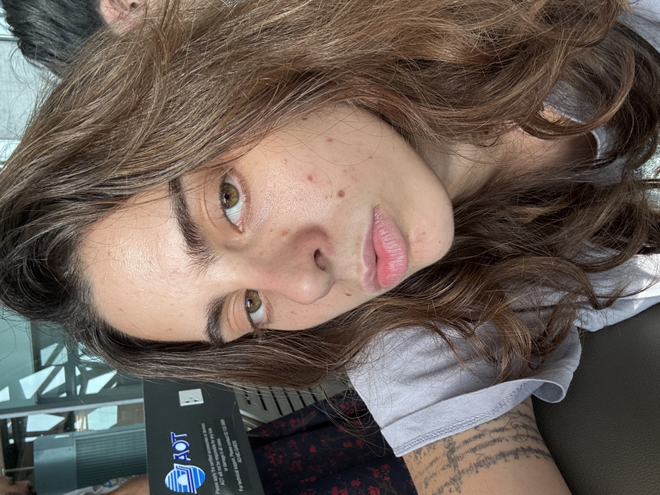 A person with light brown wavy hair, fair skin, and freckles gazes upwards with hazel eyes. Full lips are subtly highlighted. A portion of a tattoo is visible on the person's lower arm. A black card with blue and white logo "AOT" and some fine print is on their left side. A head is above the person's hair. The person wears a gray top, and the background appears to be an indoor setting.