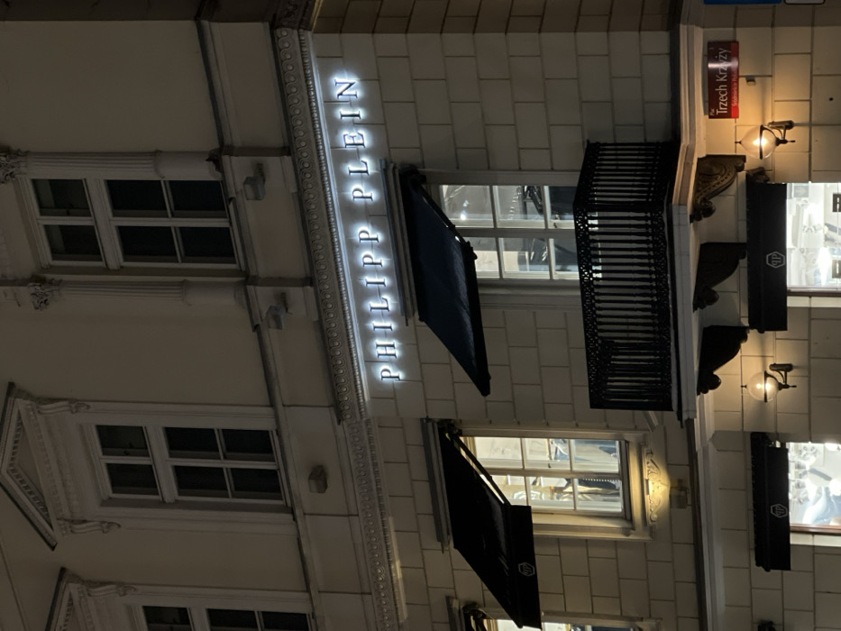 The image captures a detailed view of a multi-story building facade at night in Warsaw, Poland, specifically at Plac Trzech Krzyży, as indicated by the street sign "Plac Trzech Krzyży" (Three Crosses Square) and "Śródmieście Południowe" visible on the lower right. The building exhibits a light-colored, possibly stone or stucco exterior, adorned with classical architectural elements such as decorative window surrounds, cornices, and pilasters. The primary subject is a "PHILIPP PLEIN" luxury fashion store. Its name is displayed in large, illuminated block letters spanning across the first floor level. Below this sign, several dark-colored awnings, each featuring the distinctive "PP" emblem, are extended over the shop windows. Bright interior lighting from the store illuminates the merchandise visible through these windows. A black, ornate metal balcony with vertical bars and a decorative top rail is centrally located on the first floor, extending from the building's facade. On the ground floor, below the awnings, additional shop windows are visible, illuminated from within. Two spherical, wall-mounted light fixtures flank these ground-level windows. Upper floors of the building feature multi-pane windows that appear dark, indicating minimal or no interior lighting from those sections. There are no people visible in the scene, and the overall lighting suggests evening or nighttime conditions.