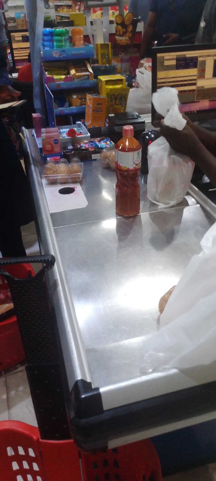 A cashier is bagging groceries at a checkout counter in a store located at the coordinates 8.991 latitude and 7.57 longitude in the city of New Karu, Nigeria. The cashier is wearing a blue shirt and appears to be a young adult male. The counter is made of stainless steel with a black edge. There are several items on the counter, including a bottle of red liquid, a package of three brown eggs, a white plastic bag, and a black cash register. The customer is not visible. The background shows a supermarket aisle with shelves filled with various products. The aisles are brightly lit with fluorescent lights. There are also shelves with several colorful items, possibly snacks. It is a typical supermarket scene.
