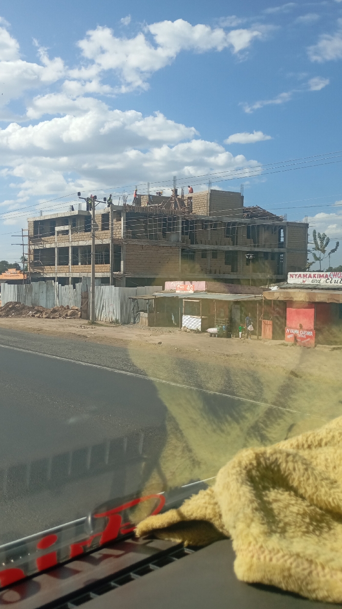 A partially constructed building, appearing to be multi-story, is the focal point, with construction workers visible on its top level. Temporary fencing surrounds the site. Several small, informal shops or stalls are situated adjacent to the construction, one marked "Nyamakima Choice Joy and Club" and another with "Nyama Choma." The scene is captured from a vehicle's interior, with a blurry dashboard and a yellow cloth partially obscuring the view. A blue sky with scattered clouds forms the backdrop.