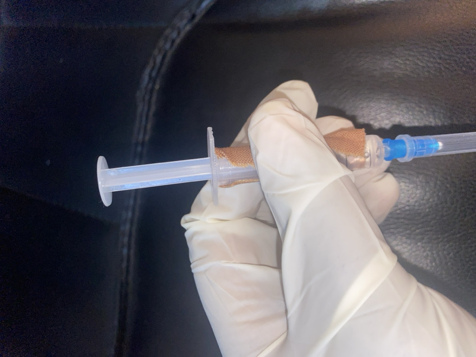 A human hand, covered by a white disposable glove, grips a transparent plastic syringe against a dark, out-of-focus background