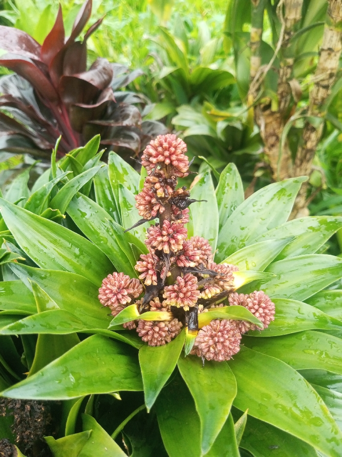 The image displays a close-up, eye-level view of a lush plant in Irupalai, Sri Lanka. The central subject is a plant with a dense rosette of wide, lanceolate, glossy green leaves, many exhibiting small water droplets on their surfaces. Emerging from the center of these leaves is a prominent, upright stalk bearing multiple spherical to ovoid clusters of small, compact, reddish-brown florets or developing fruits. These clusters are distributed along the central stalk, with some dark, dried botanical remnants interspersed among them. The background is an out-of-focus natural environment, featuring blurred green foliage. To the left, a plant with dark burgundy leaves is partially visible, while to the right, lighter green foliage and a segmented, light brown woody stem are discernible. No human figures or discernible actions are present in the scene. The lighting is natural and diffuse, consistent with an outdoor setting.