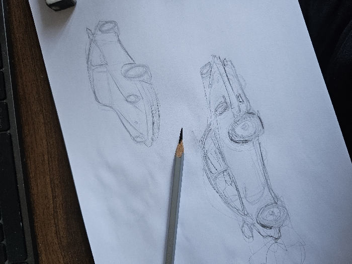 The image depicts an indoor, tabletop scene located in the city of London, United Kingdom, centered on a drawing activity. A white sheet of paper, occupying most of the frame, displays two graphite pencil sketches of classic Porsche 911-style sports cars. The upper sketch is a simplified, profile-like representation of a Porsche, featuring a rear 'whale tail' spoiler, oriented towards the right. The lower sketch provides a more detailed, rough rendering of a similar classic Porsche 911, viewed from the front-left three-quarter angle, complete with visible construction lines for the body, headlights, bumper, and wheels. A grey wooden pencil, with a sharpened lead tip, rests horizontally across the paper, pointing towards the lower sketch. In the top-right corner of the paper, a white eraser partially enclosed within a black sleeve is visible. The paper rests on a dark brown wooden surface, visible at the top, and a black computer keyboard is partially discernible immediately above this wooden surface. A dark, indistinct fabric surface is visible in the lower-right portion of the image.