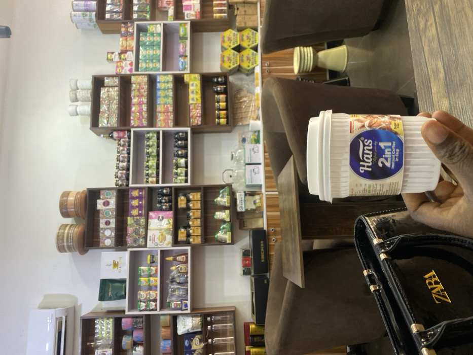 This image depicts an indoor scene within a retail establishment or cafe, located in Kabala, Nigeria. In the foreground, a person's dark-skinned right hand holds a white, fluted disposable cup with a white lid. The cup features a label for "Hans 2in1 Instant Coffee In Cup" with "Sugar Free" text visible. To the left, a black, glossy handbag with gold "ZARA" lettering is partially visible on a surface. The midground features a square wooden table with a dark brown base, flanked by two dark brown upholstered armchairs. Behind the seating area, a light-colored wooden counter or cabinet displays various items, including several black boxes (one labeled "SMONEES") and multiple clear glass containers. The background wall is fitted with a system of mixed light wood and white shelves, organized into multiple compartments. These shelves are filled with an extensive array of packaged goods, primarily boxes of tea and coffee, jars of what appear to be honey or spreads, and bottles of liquids. A white split-unit air conditioner is mounted on the upper left wall. No other individuals are visible in the scene.