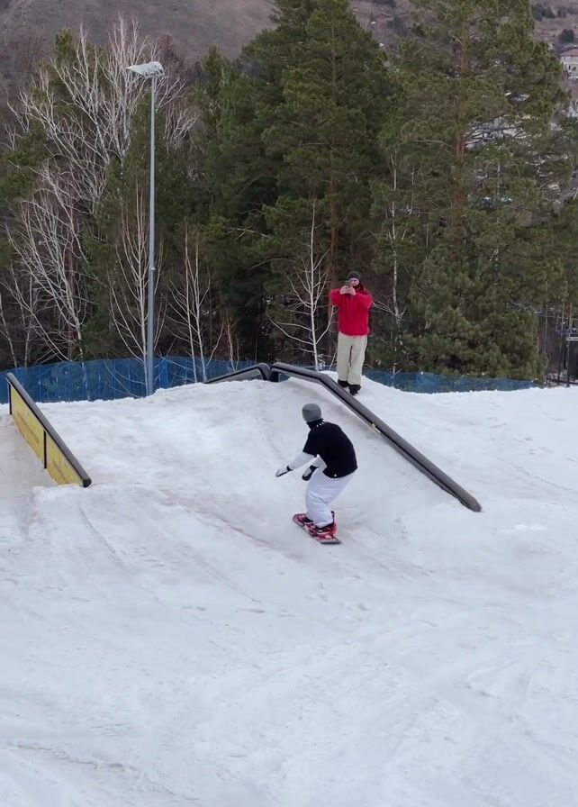 snowy hillside with two ramps and two people. A person in a black top, white pants, and a gray helmet attempts to snowboard up and over the ramp on the left. They do not successfully ride over the ramp and fall back down the snow. In the background, a person in a red jacket and light pants stands on the ramp on the right side of the screen, clapping. Behind the ramps are bare white trees, tall green trees, light posts, and a distant mountain range. There is a blue fence on the left.