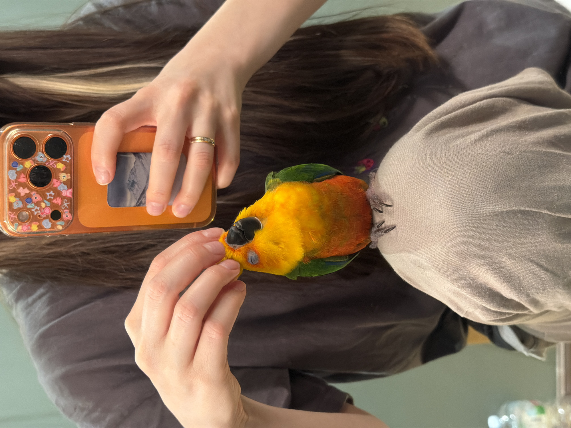 An overhead shot shows a person holding a smartphone with a brightly decorated case in their left hand, while their right hand gently touches the head of a colorful parrot perched on their shoulder